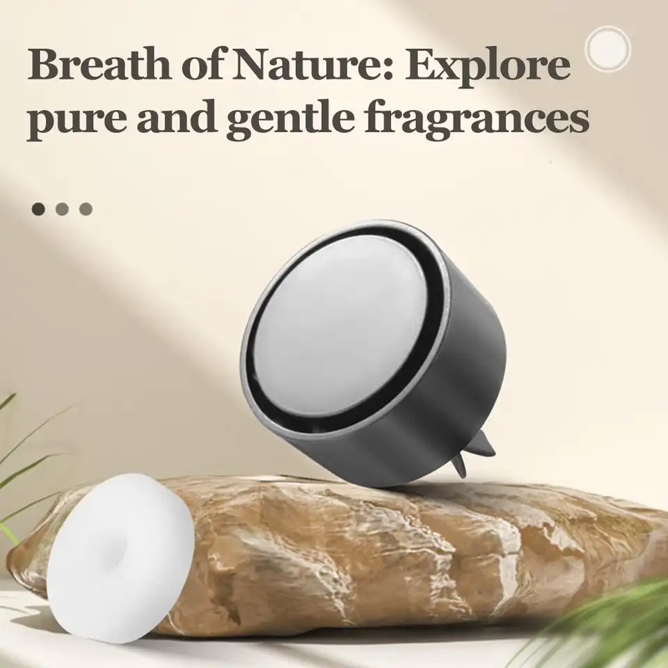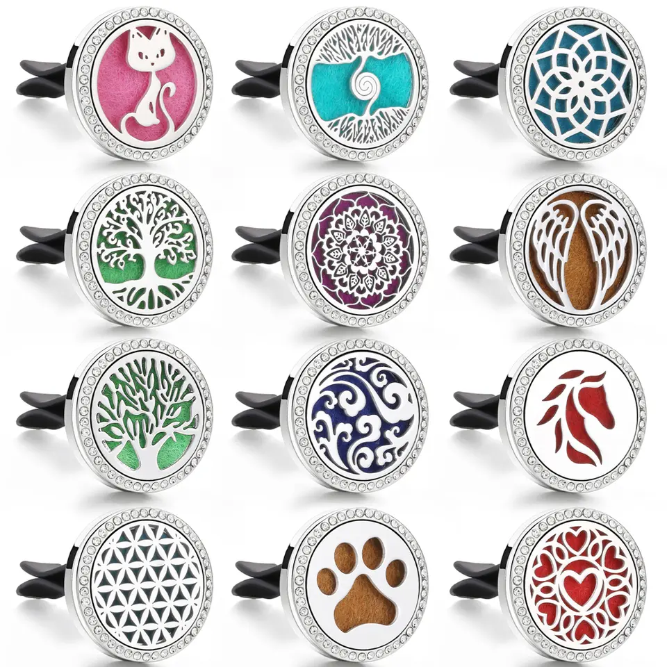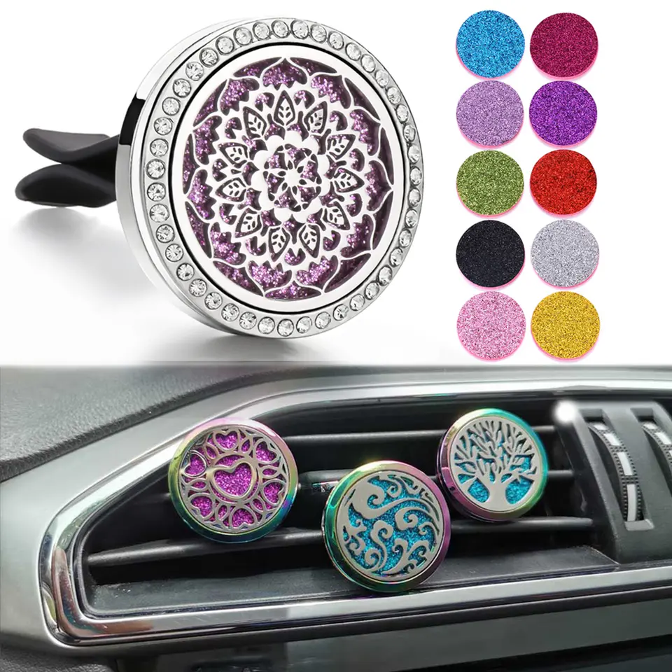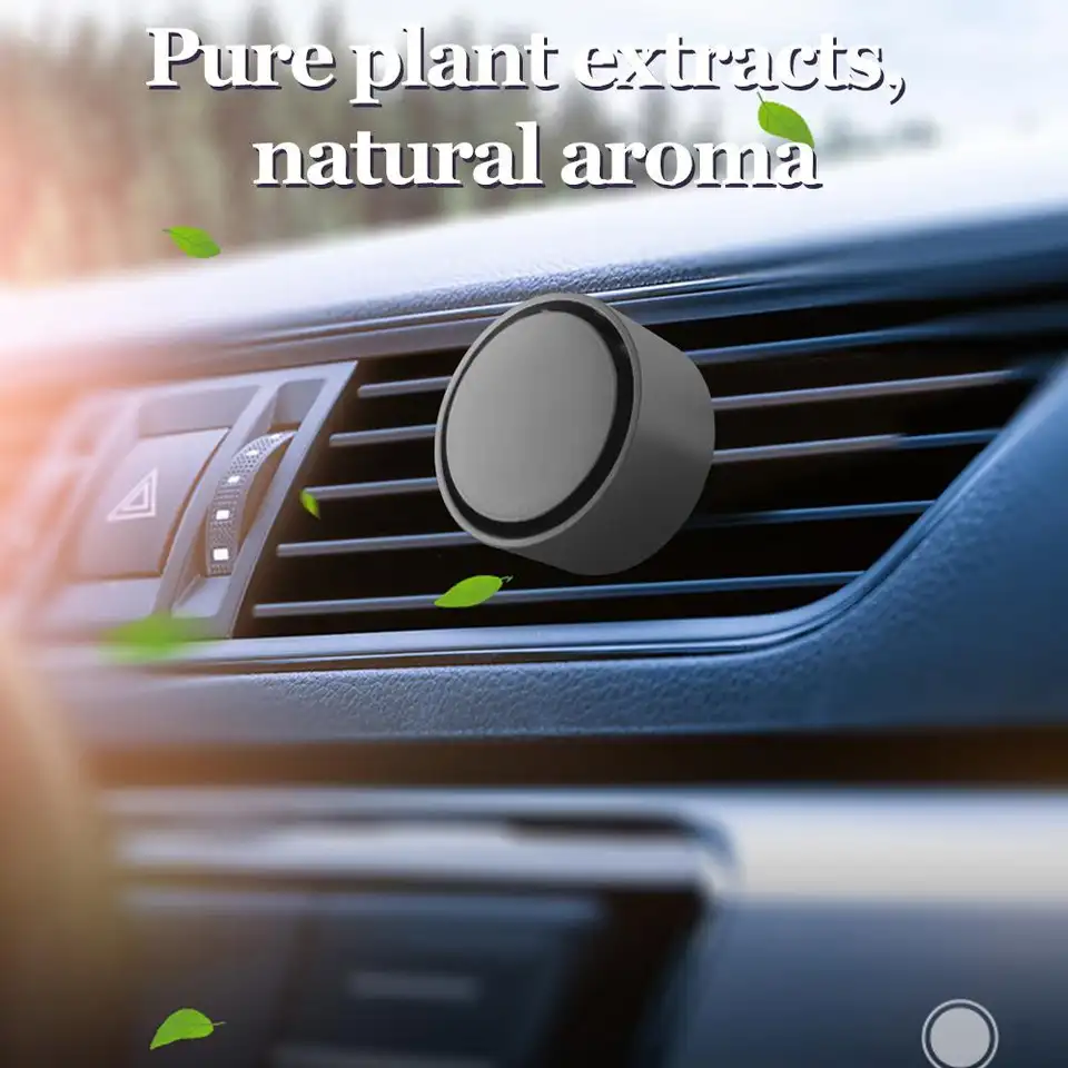 Product details:Name: Car AromatherapyFragrance: Sage/Jasmine/Lavender/Peach/OrangeSize: About 38*39 mmMaterial: Plastic + Liquid (about 15 ml)Installation method: Just clip it on the